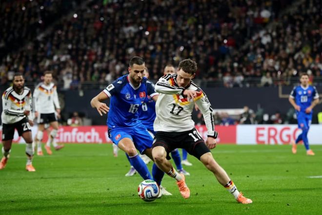 德国队在世预赛关键战中6-0大胜斯洛伐克,锁定2026年世界杯席位。
